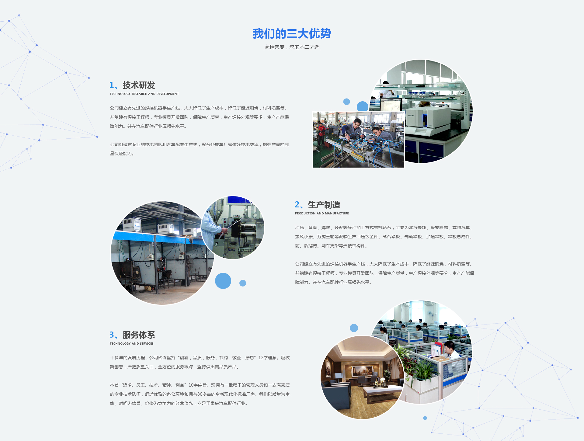 公司由建廠初期單一的沖壓加工逐步發展到沖壓、彎管、焊接、裝配等多種加工方式有機結合,主要為北汽銀翔、長安跨越、鑫源汽車、東風小康、萬虎三輪等配套生產沖壓鈑金件、離合踏板、制動踏板、加速踏板、踏板總成件、前、后擺臂、副車支架等焊接結構件,深受用戶好評...